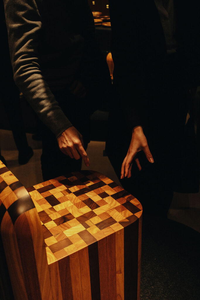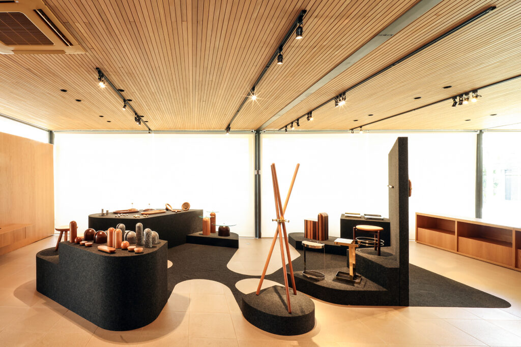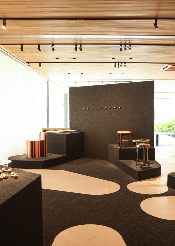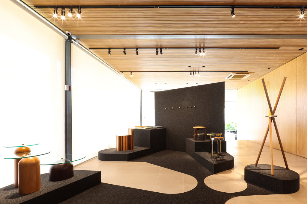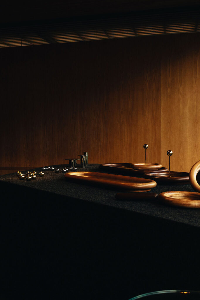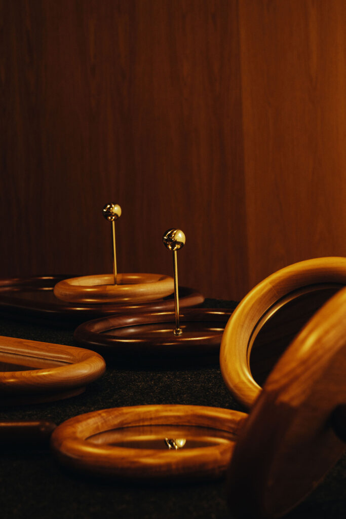 Nesse estudo, o que é mais intrigante é o seu uso não apenas como recurso estético, mas de fato uma ferramenta construtiva. Esse entendimento de um sistema fica evidente na Coleção Aro, em que espelhos redondos são circunscritos por anéis de madeira que, por sua vez, estão interconectados por pequenas esferas de latão – o círculo se torna ao mesmo tempo forma, função e expressão.
